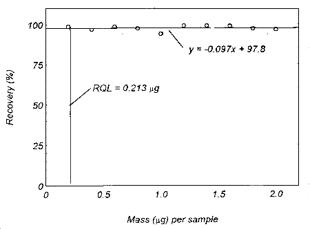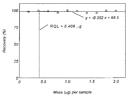 The RQL is the lowest loading at which 75% of the analyte, or more, can be recovered as determined from the regression line of the plotted data.