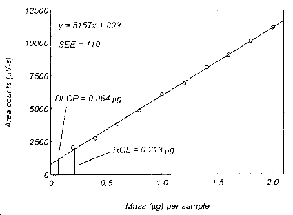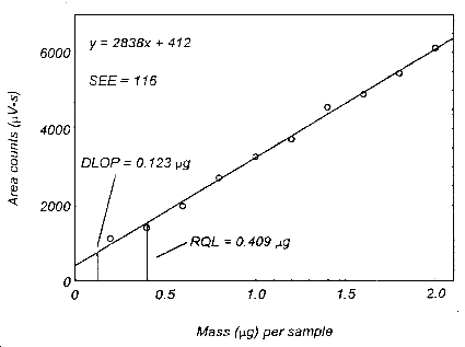 ![]() Figure 1.2.1.2. Plot of data to determine the DLOP/RQL for methacrylic acid. 1.2.2 Reliable quantitation limit (RQL) The reliable quantitation limit is 0.213 µg per sample for acrylic acid (0.00301 ppm), and 0.409 µg per sample for methacrylic acid (0.00475 ppm). This is the amount of analyte spiked on a sampler that will give a signal that is considered the lower limit for precise quantitative measurements. The RQL is considered the lower limit for precise quantitative measurements. It is determined from the regression line data obtained for the calculation of the DLOP (Section 1.2.1 ), providing at least 75% of the analyte is recovered. The RQL is defined as the concentration of analyte that gives a response (YRQL) such that