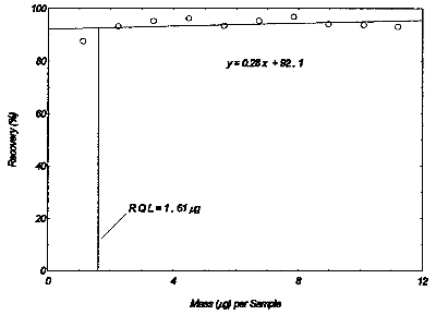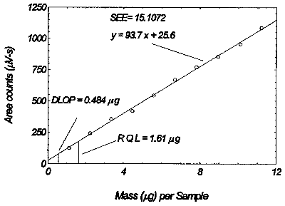 1.2.2 Reliable quantitation limit (RQL) The reliable quantitation limit is 1.61 µg per sample (0.013 ppm). This is the amount of analyte spiked on a sampler that will give a signal that is considered the lower limit for precise quantitative measurements. The RQL is considered the lower limit for precise quantitative measurements. It is determined from the regression line data obtained for the calculation of the DLOP (Section 1.2.1), providing at least 75% of the analyte is recovered. The RQL is defined as the concentration of analyte that gives a response (YRQL) such that YRQL - YBR 10(SDBR) therefore