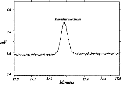 The OSHA SLTC received samples collected on charcoal tubes requesting analysis for dimethyl succinate (DMSU). A desorption study using carbon disulfide showed poor recovery, 72%, when a concentration of 448 µg DMSU was spiked on the tubes. Desorption studies using 1:99 DMF:CS2 averaged 93.8% recovery over the concentration range of 22.4 to 448 µg DMSU. The retention study showed no loss of DMSU. The storage studies had a loss of DMSU with samples collected with 20 liters humid air (80% RH at 22°C), especially those stored at room temperature, but samples stored under refrigeration had better recoveries. Storage recoveries, corrected for desorption, on day 7 were: dry refrigerated 101%, dry ambient 100%, humid refrigerated 92.8%, and humid ambient 82.2%. Storage recoveries, corrected for desorption, on day 14 were: dry refrigerated 100%, dry ambient 98.8%, humid refrigerated 86.3%, and humid ambient 76.3%. Samples should be refrigerated as soon as possible after sampling, and should be analyzed within one week of receiving them. 1.1.2 Toxic effects (This section is for information only and should not be taken as the basis of OSHA policy.) (Ref. 5.2) DMSU is a skin, eye, and mucous membrane irritant. The Canadian recommended exposure limit for DMSU is 10 mg/m3. At the time this study was written, there was no PEL or TLV for DMSU. 1.1.3 Workplace exposure (Ref. 5.2 and 5.3) DMSU is used as a solvent in paints, lacquers, varnishes, nitrocellulose, paint strippers, dyes, fats, photography, and waxes. DMSU is used in perfumes and flavorings for candy, ice cream, and gum. DMSU is used in the manufacture of other succinates. 1.1.4 Physical properties and other descriptive information (Ref. 5.2, 5.3, and 5.4)