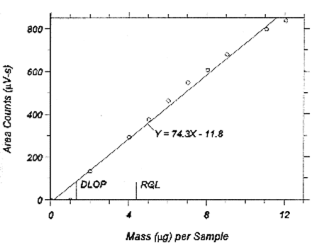 The RQL is considered the lower limit for precise quantitative measurements. It is determined from the regression line data obtained for the calculation of the DLOP (Section 1.2.1), providing at least 75% of the analyte is recovered. In this study, the recovery was 100%. The RQL is defined as the concentration of analyte that gives a response (YRQL) such that