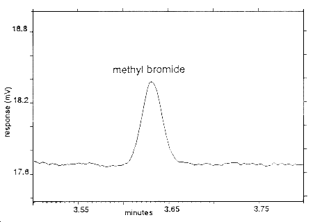 3.3.2 A third standard at a lower concentration was prepared to check the linearity of the calibration at a concentration of 100 µL methyl bromide in 4 mL desorbing solution or 25 µL/mL or 104 µg/mL. A fourth standard was prepared by diluting 1/10 the first standard for a concentration of 42.2 µg/mL 3.4 Sample preparation