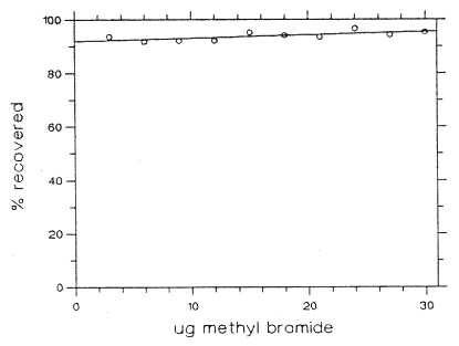 2.5 Sample storage The front sections of twelve sampling tubes were each spiked with 443 µg (38 ppm) of methyl bromide. Twelve more tubes had 3 liters of humid air (80% RH at 21°C) drawn through them before they were spiked with 443 µg (38 ppm) of methyl bromide. Six of each kind were stored at room temperature, approximately 24°C, and the other six of each kind were stored in the refrigerator at 0°C. Three of each type of samples were analyzed after 7 days and the remaining three samples of each type after 14 days. The amounts recovered indicate good storage stability for the time period studied for the refrigerated samples, but poor recoveries for the samples stored at room temperature. The refrigerated samples had an average recovery of 99.5% for dry samples and 94.2% for humid air samples. Samples were corrected for desorption efficiency. There was migration of the methyl bromide with time, with the amounts found on the back section of the tubes increasing from 5% to 11.7% in the refrigerated samples, and from 28% to 44% of amount recovered in the samples stored at room temperature. This indicates the importance of sampling with two tubes in series, as breakthrough can only be determined if the tubes are separated after sampling and analyzed separately. The poor storage at room temperature indicates that samples should be refrigerated as soon as possible after sampling, and samples should be kept cold until analysis.