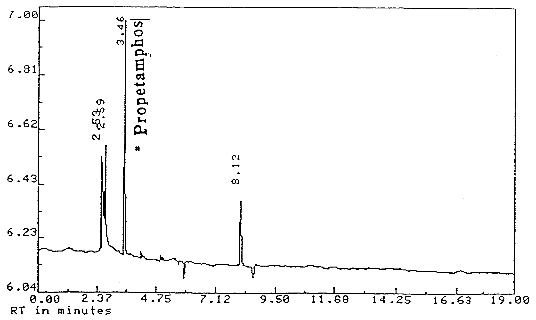 3.1.2. A GC column capable of resolving propetamphos from any interferences. A 60 m x 0.32 mm i.d. SE-30 GC capillary column, 0.25 µm thick film, was used in this evaluation and is available from Supelco, Inc., Bellefonte, PA. 3.1.3. An electronic integrator or other suitable means of measuring detector response. A Hewlett-Packard 3392A Integrator and a Hewlett-Packard 3357 data system were used in this evaluation. 3.1.4. Vials, 4-mL and 2-mL glass with PTFE-lined septa. 3.1.5. Volumetric flasks, pipets, and syringes. 3.2. Reagents