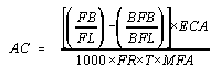 where: AC = Airborne fiber concentration FB = Total number of fibers greater than 5 µm counted FL = Total number of fields counted on the filter BFB = Total number of fibers greater than 5 µm counted in the blank BFL = Total number of fields counted on the blank ECA = Effective collecting area of filter (385 mm(2) nominal for a FR = Pump flow rate (L/min) MFA = Microscope count field area (mm(2)). This is 0.00785 mm(2) for a T = Sample collection time (min) 1,000 = Conversion of L to cc
