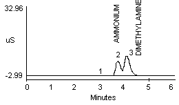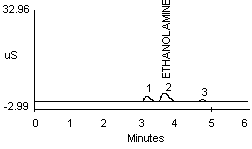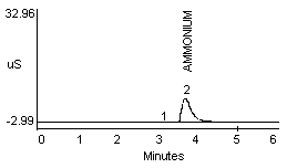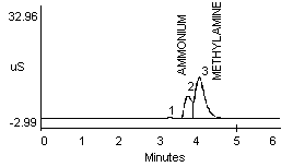 4.2.2. A peak in the same vicinity as ammonia was noted when a dilute monoethanolamine (MEA) solution was analyzed (see Figure 1f). The detector response for MEA is about one-half that seen for ammonia at a concentration of approximately 10 µg/mL (Figure 1a and 1f). Separation of ammonium and MEA was not noted when a 1:1 mixture (10 µg/mL for each) was analyzed when using either the recommended or the alternate eluent.