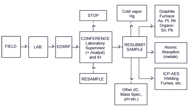 hygiene air, wipe, and bulk samples. Samples are analyzed for element composition only, and up to 70