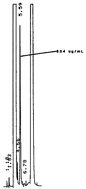 3.5.2. Chromatogram A typical chromatogram of chloroform under the GC conditions used in the analysis is shown in Figure 3.5.2. 3.5.3. Peak areas are measured by an electronic integrator or other suitable means. 3.5.4. An internal standard procedure is used. The integrator is calibrated to report results in ppm for a 10-L air sample after correction for desorption effieiency. 3.6. Interferences (analytical)