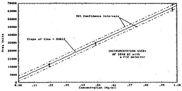 1.2.2. The pooled coefficient of variation of the analytical procedure over the range of 0.213 to 1.068 mg per sample is 0.029 (Section 4.2.). This represents an air concentration range of 4.4 to 21.9 ppm based on the recommended sampling and analytical procedures. 1.2.3. The sensitivity of the analytical procedure over a concentration range representing 0.5 to 2 times the PEL or target concentration based on the recommended air volume is 58812 area units per mg/mL. The sensitivity is determined by the slope of the calibration curve (Section 4.2.). The sensitivity will vary somewhat with the particular instrumentation used in the analysis. 1.2.4. The lower limit of the estimated working range, assuming adequate desorption efficiency is 0.11 ppm. The upper limit of the working range is dependent on the capacity of the collection medium. 1.3. Accuracy