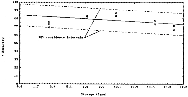 4.3. Storage data Thirty-six samples were collected on charcoal tubes (SKC Lot 107) from a dynamic test atmosphere containing 10 ppm chloroform and 80% relative humidity. The recommended sampling conditions were used. Six samples were analyzed immediately. The remainder were divided into two equal groups, one stored at room temperature (21 to 26°C) and the other under refrigeration (-1 to 0°C). Three samples from each group were analyzed at 3 or 4 day intervals over 16 days.