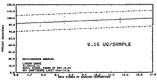 4.5. Storage Samples were generated by the liquid injection of DENA on Polar Partition tubes containing about 150 mg of adsorbent. The tubes were allowed to equilibrate overnight and then were placed in front of the treated Florisil tubes. Twenty-five liters of air, at 80% relative humidity and 22°C, were drawn through the sampling train. The DENA on the Polar Partition tube was desorbed by the humid air and was deposited on the air sampler. Studies conducted at ambient relative humidity and temperature indicated that desorption was essentially complete after 1 L of air had passed through the Polar Partition tube (Figure 4.5.1.). In these studies the spiked Polar Partition tube was connected directly to the TEA. The data in Table 4.5. represent the effects of storage at ambient