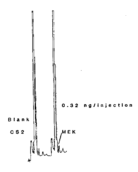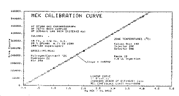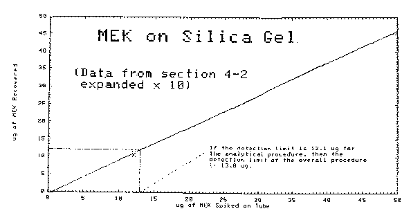 Figure 3.5.1. Chromatogram of an MEK standard. Figure 4.1. Chromatograms for the detection limit. Figure 4.2.1. Detection limit of the overall procedure. Figure 4.2.2. Detection limit of the overall procedure. Figure 4.4. Calibration curve. Figure 4.6..1. Refrigerated storage. Figure 4.6.2. Ambient storage. Figure 4.6.3. Refrigerated versus ambient storage. Figure 4.7. Breakthrough curve. Figure 4.8.1. Chromatograms for the detection limit. Figure 4.8.2. Calibration curve. Figure 4.8.4.1. Refrigerated storage. Figure 4.8.4.2. Ambient storage. Figure 4.8.4.3. Refrigerated versus ambient storage. Figure 4.8.5. Breakthrough curve. 5. References