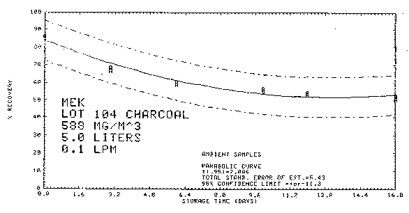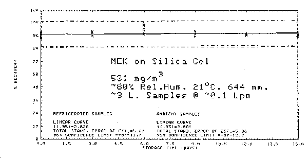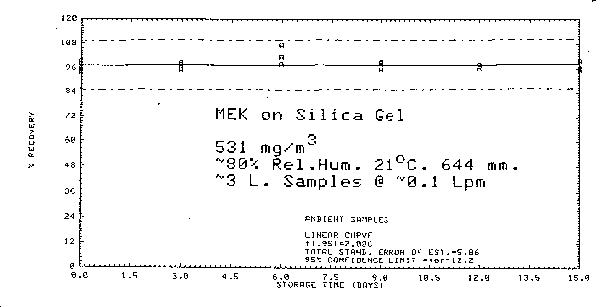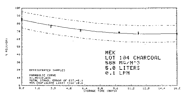 An additional sample was tested for breakthrough under the above conditions except dry air was used. The breakthrough volume was increased to 20.3 L or 23.8 mg of MEK. 4.8. Collection of MEK on lot 104 (petroleum-base) charcoal The collection of MEK on Lot 104 charcoal was also evaluated. The procedure is the same as the silica gel method except the collection volume is increased to 5 L, only one tube is used for collection, and carbon disulfide is used as the desorption solvent.