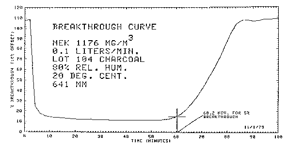 2.4.2. The breakthrough volume is severely lowered by high relative humidity. With dry air (essentially 0% relative humidity) the breakthrough volume under the conditions described in 2.4.1. is increased to 20.3 L. Also, water will displace MEK as shown in Figure 4.7. 2.5. Desorption efficiency