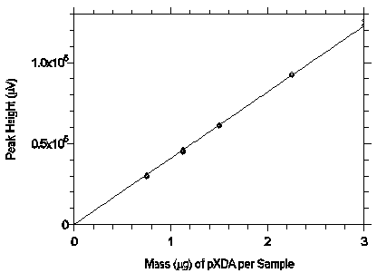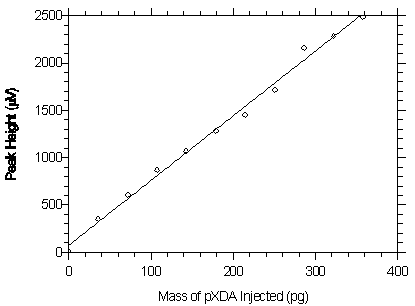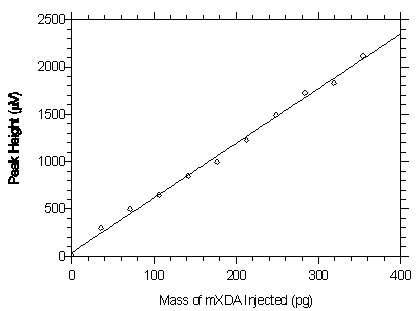 4.2 Detection limit of the analytical procedure (DLAP) The DLAP is measured as the mass of analyte introduced into the chromatographic column. Ten analytical standards were prepared in equal descending increments with the highest standard containing 14.16 and 14.31 ng/mL of mXDA and pXDA respectively. These concentrations produce peaks approximately 10 times the baseline noise of a reagent blank. These standards, plus a solvent blank, were analyzed and the data obtained were used to determine the required parameters (A and SEE) for the calculation of the DLAPs. Values of 5.78 and 6.84 for A and 47.0 and 69.9 for SEE were obtained for mXDA and pXDA respectively. DLAPs were calculated to be 24.4 and 30.7 pg for mXDA and pXDA respectively.