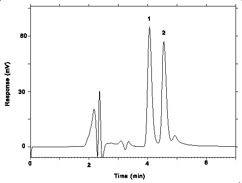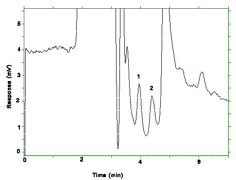 3.6 Interferences (analytical) 3.6.1 Any compound that produces a response on a UV detector at 208 nm and has the same general retention time of any of the analytes of interest is a potential interference. Possible interferences should be reported to the laboratory with submitted samples by the industrial hygienist. These interferences should be considered before samples are extracted. 3.6.2 HPLC parameters may be changed to possibly circumvent interferences. 3.6.3 When necessary, the identity or purity of an analyte peak may be confirmed with additional analytical data, such as wavelength ratioing. As an aid in choosing appropriate wavelengths to ratio, the UV spectra for both analytes is given in Section 4.10. 3.7 Calculations The analyte concentration for samples is obtained from the appropriate calibration curve in terms of micrograms of analyte per sample. The back filter of each sampler is analyzed primarily to determine if there was any breakthrough from the front filter during sampling. If a significant amount of analyte is found on the back filter (e.g., greater than 25% of the amount found on the front filter), this fact should be reported with sample results. If any analyte is found on the back filter, it is added to the amount found on the front filter. This total amount is then corrected by subtracting the total amount (if any) found on the blank. The air concentration is calculated using the following formula. mg/m³ = (µg of analyte per sample)/[(L of air sampled)(extraction efficiency)] 3.8 Safety precautions (analytical) 3.8.1 Adhere to the rules set down in your Chemical Hygiene Plan. 3.8.2 Avoid skin contact and inhalation of all chemicals. 3.8.3 Wear safety glasses and a lab coat at all times while in the lab area. 4. Backup Data