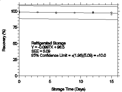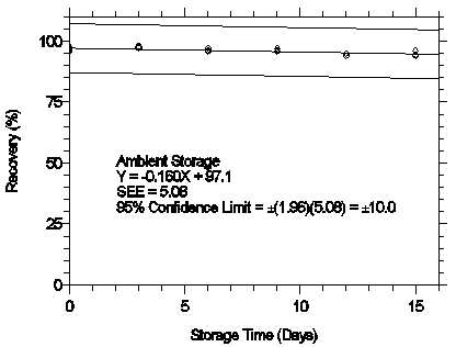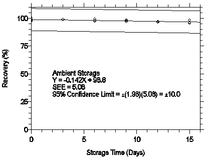 The analyte air concentrations throughout this method are based on the recommended sampling and analytical parameters. 1.2 Limit defining parameters 1.2.1 Detection limit of the analytical procedure The detection limits of the analytical procedure are 24.4 and 30.7 pg for mXDA and pXDA respectively. These are the amounts of each analyte that will give responses that are significantly different from the background response of a reagent blank. (Sections 4.1 and 4.2) 1.2.2 Detection limit of the overall procedure The detection limits of the overall procedure are 4.1 ng per sample (0.27 µg/m3) and 5.0 ng per sample (0.33 µg/m3) for mXDA and pXDA respectively. These are the amounts of each analyte spiked on the sampler that will give responses that are significantly different from the background response of a sampler blank. (Sections 4.1 and 4.3) 1.2.3 Reliable quantitation limit The reliable quantitation limits are 13.6 ng per sample (0.91 µg/m3) and 16.8 ng per sample (1.12 µg/m3) for mXDA and pXDA respectively. These are the amounts of each analyte spiked on a sampler that will give signals that are considered the lower limits for precise quantitative measurements. (Section 4.4) 1.2.4 Precision (analytical procedure) The precisions of the analytical procedure, measured as the pooled relative standard deviations over a concentration range equivalent to 0.5 to 2 times the target concentration, are 0.37% and 0.93% for mXDA and pXDA respectively. (Section 4.5) 1.2.5 Precision (overall procedure) The precision of the overall procedure at the 95% confidence level for the ambient temperature 15-day storage test (at the target concentration) is ±10.0% for both mXDA and pXDA. (Section 4.6). These include an additional 5% for sampling error. 1.2.6 Recovery The recovery of analyte from samples used in a 15-day storage test remained above 95% and 97% for mXDA and pXDA respectively when the samples were stored at ambient temperatures. (Section 4.7) 1.2.7 Reproducibility Six samples spiked by liquid injection, with a draft copy of this procedure, were submitted to an SLTC service branch for analysis. The samples were analyzed after nine days of storage at 0°C. No individual sample result deviated from its theoretical value by more than the precision reported in Section 1.2.5. (Section 4.8) 2. Sampling Procedure 2.1 Apparatus