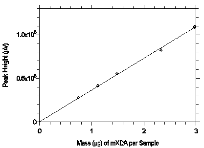 three-piece 2.2 Reagents None required 2.3 Technique 2.3.1 Remove the plastic end plugs from the sampling device immediately before sampling. 2.3.2 Attach the sampling device to the sampling pump with flexible tubing and place the device in the employee's breathing zone. Position the sampler so it does not impede work performance or safety. 2.3.3 Do not pass the sampled air through any hose or tubing before it enters the sampling device. 2.3.4 Immediately after sampling, seal the sampling device with plastic end plugs and seal and identify with an OSHA Form 21. 2.3.5 Submit at least one blank with each sample set. Blanks should be handled in the same manner as samples, except no air is drawn through them. 2.3.6 Record sample volumes (in liters of air) for each sample. Also list any compounds considered potential interferences that could be present in the sampling area. 2.3.7 If any bulk samples are submitted for analysis, ship them in separate containers from the air samples. 2.4 Sampler capacity Collection efficiency studies were conducted by drawing humid air through a sampling device that was attached to a glass U-tube immersed in an oil bath heated to 40°C. Milligram amounts of mXDA and pXDA were added to the U-tube. The inlet of the U-tube was attached to a humid air generator so air at approximately 80% relative humidity could be drawn through it. Tests were done by drawing air for 15 minutes at 1.0 L/min and also for 200 minutes at 1.0 L/min. After sampling, the filters were analyzed. None of the amines were found on any of the back filters for any of the tests. There was an average of 7.4 µg of mXDA and 5.6 µg of pXDA found on the front filters for the 15-L samples, and 37.9 µg of mXDA and 26.1 µg of pXDA for the 200-L samples. 2.5 Extraction efficiency 2.5.1 The average extraction efficiency over the range of 0.5 to 2 times the target concentration is 98.8% and 98.6% for mXDA and pXDA respectively. (Section 4.9.1) 2.5.2 The extraction efficiency at 0.05, 0.1, and 0.2 times the target concentration was found to be 96.6%, 98.2%, and 96.7% respectively for mXDA and 97.6%, 98.6%, and 97.0% respectively for pXDA. (Section 4.9.1) 2.5.3 Extracted samples remain stable for at least 24 h. (Section 4.9.2) 2.6 Recommended air volume and sampling rate 2.6.1 For short-term and ceiling samples, sample 15 L of air at 1 L/min (15-min samples). 2.6.2 For long-term samples, sample 100 L of air at 1 L/min. 2.7 Interferences (sampling) 2.7.1 It is not known if any compounds will severely interfere with the collection of the analytes on sulfuric acid treated filters. 2.7.2 Suspected interferences should be reported to the laboratory with submitted samples. 2.8 Safety precautions (sampling) 2.8.1 Attach the sampling equipment to the employee so that it will not interfere with work performance or safety. 2.8.2 Follow all safety procedures that apply to the work area being sampled. 3. Analytical Procedure 3.1 Apparatus 3.1.1 An HPLC system equipped with an ultraviolet detector. A Hewlett-Packard 1050 Series HPLC consisting of a pumping system, programmable variable wavelength detector and an autosampler was used in this evaluation. 3.1.2 An HPLC column capable of separating the analyte of interest from any interferences. A 15-cm × 4.6-mm i.d. Supelcosil LC-ABZ column (Supelco, Inc., Bellefonte, PA, Catalog no. 5-9140) was used in this evaluation. It is critical that if this particular column will not be used for more than 6 h, it should be rinsed with water to remove any buffer salts and ultimately flushed with acetonitrile. 3.1.3 An electronic integrator or some other suitable means of measuring peak heights or areas. A Waters 860 Networking Computer System was used in this evaluation. 3.1.4 Glass vials with Teflon®-lined caps capable of holding 4 mL. 3.1.5 A dispenser capable of delivering 2.0 mL of extraction solvent to prepare standards and samples. If a dispenser is not available, a 2.0-mL volumetric pipet may be used. 3.1.6 A test tube rocker to gently mix the samples during the extraction step. A Vari-Mix mixer (Thermolyne, Dubuque, IA) was used in this evaluation. 3.1.7 A laboratory centrifuge. 3.2 Reagents 3.2.1 m-Xylylenediamine (mXDA) and p-xylylenediamine (pXDA), reagent grade. Aldrich Chemical (Milwaukee, WI) Lot KY00202DP mXDA and Lot PF10421AF pXDA were used in this evaluation. Both of these compounds are corrosive and must be stored under a blanket of nitrogen. 3.2.2 Acetonitrile, methanol, and water, HPLC grade. The acetonitrile and methanol used in this evaluation were "Optima" brand from Fisher Chemical (Fair Lawn, NJ) and the water was from a Millipore Milli-Q water purification system. 3.2.3 Sodium phosphate, monobasic monohydrate (NaH2PO4·H2O), reagent grade. Fisher Lot 704979 was used in this evaluation. 3.2.4 1-Heptanesulfonic acid, sodium salt, HPLC grade. Aldrich Lot HF06915BF was used in this evaluation. 3.2.5 Phosphoric acid, reagent grade. 3.2.6 Extraction solvent/mobile phase. The extraction solvent is the same as the mobile phase used in the HPLC analysis. It consists of 50 mM of 1-heptanesulfonic acid and 50 mM of NaH2PO4·H2O in 75/25, water/acetonitrile adjusted to pH 3.0 with phosphoric acid. To prepare 1 L of the extraction solvent/mobile phase, dissolve (expedite using sonication) 10.1 g of 1-heptanesulfonic acid, sodium salt and 6.9 g of NaH2PO4·H2O into 750 mL of HPLC grade water and adjust the pH of the solution to 3.0 with phosphoric acid. Add, with thorough mixing, 250 mL of acetonitrile to the pH-adjusted aqueous solution. 3.3 Standard preparation 3.3.1 Prepare concentrated standards by accurately weighing approximately 20 mg of each amine into a 25-mL volumetric flask. Dissolve the amines with methanol. Dilute to the mark with additional methanol and thoroughly mix the solution. Stock standards are stable for at least 6 months when stored in brown bottles. 3.3.2 Prepare analytical standards by injecting microliter amounts of stock standards into 4-mL